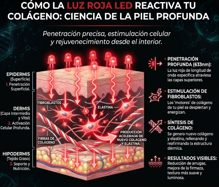 La terapia de luz roja usa longitudes de onda específicas que penetran en las capas profundas de tu piel. Esto activa tus células y les da la energía que necesitan para producir más colágeno, la proteína que mantiene tu piel firme y joven. No es magia. Es ciencia. Las clínicas llevan años usando esta tecnología. Ahora puedes tenerla en casa, sin citas, sin desplazamientos y sin pagar cientos de euros cada mes. Solo 10 minutos al día es suficiente para que tu piel empiece a recuperar la firmeza y la luz que tenía antes.